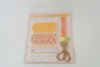 フェルトに絵柄がプリントされたプリントフェルトのタグセットができました。リボンやボタン、ラインストーンも使ってデコラージュを楽しもう♪